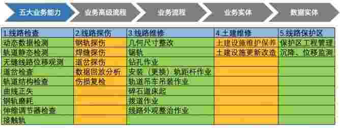 在轨道运维业务中,,,我们形成了完整的从业务能力(业务域)-业务流程-业务实体-数据模型的分析梳理过程。。。轨道运维业务能力如下图所示::