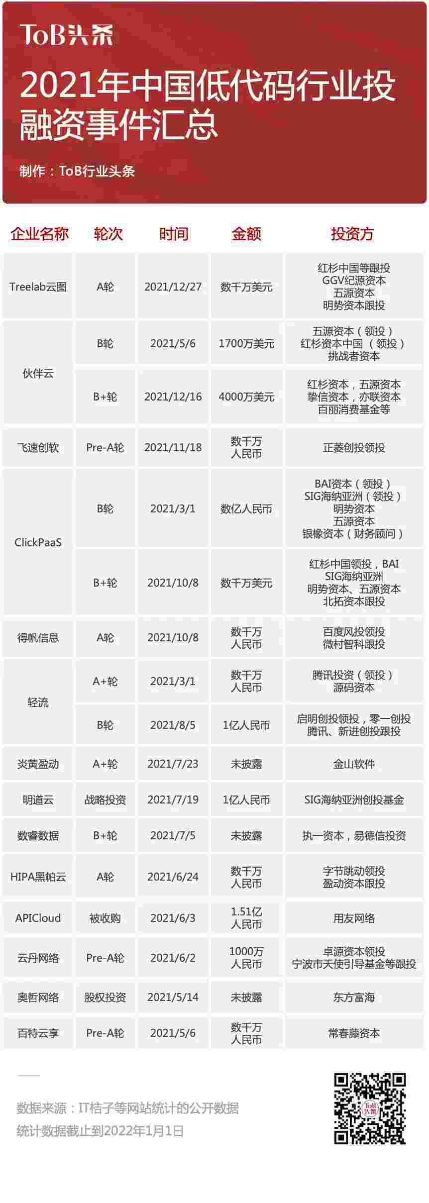 到2021年,,,,无/低代码投融资规模势头更甚,,其中包括轻流两轮融资(A+轮数千万人民币,,B轮近亿人民币)、、、钱能钱包 两轮融资(B轮数亿人民币,,,B+轮数千万美元)、、、、百特云享数千万元Pre-A轮融资......